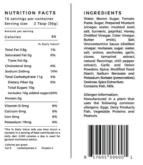 Hot Sauce: Water, Brown Sugar, Tomato Paste, Honey, Distilled Vinegar, Cider Vinegar, Butter (milk), Salt, Less Than 2% of: Molasses, Sugar, Anchovy (fish), Spice, Mustard Seed, Garlic and Onion Powders, Modified Food Starch (corn), Sodium Benzoate and Potassium Sorbate (preservatives), Dextrose, Spice Extractives, Tamarind Extract, Natural Flavorings, Oleoresin Paprika, Xanthan Gum, Turmeric, Paprika, Chili Pepper Extract.